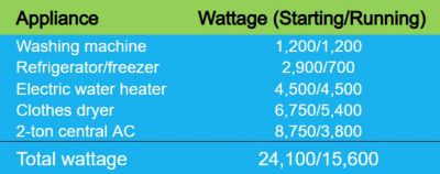 Here’s an example calculation for powering what some would consider “essential” home appliances: